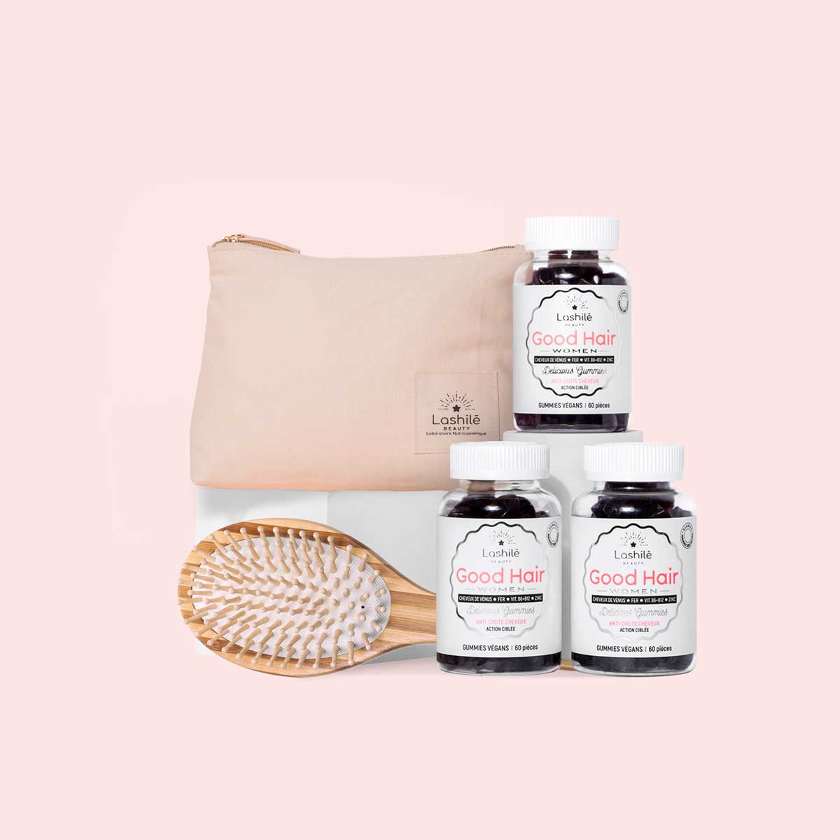 Nuestra fórmula Good Hair Women (3 meses) combinada con nuestro cepillo masajeador para el cuero cabelludo y nuestro estuche de belleza ultra-suave.