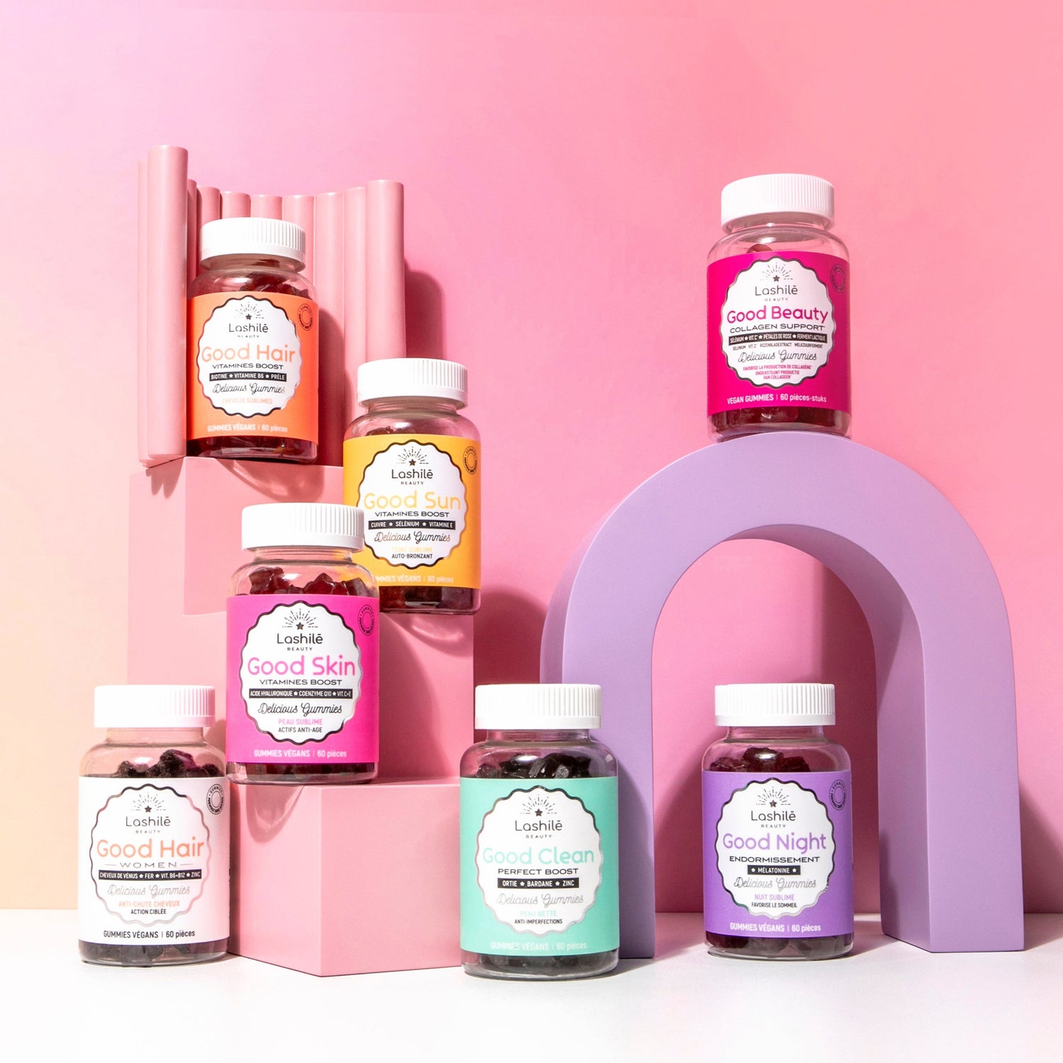 Concentrados en vitaminas, minerales, oligoelementos y principios activos, los gummies de Lashilé Beauty actúan de manera eficaz para realzar tu belleza natural (cabello, piel, cuerpo...) y cuidar tu bienestar (sueño, desintoxicación, libido...) a diario.