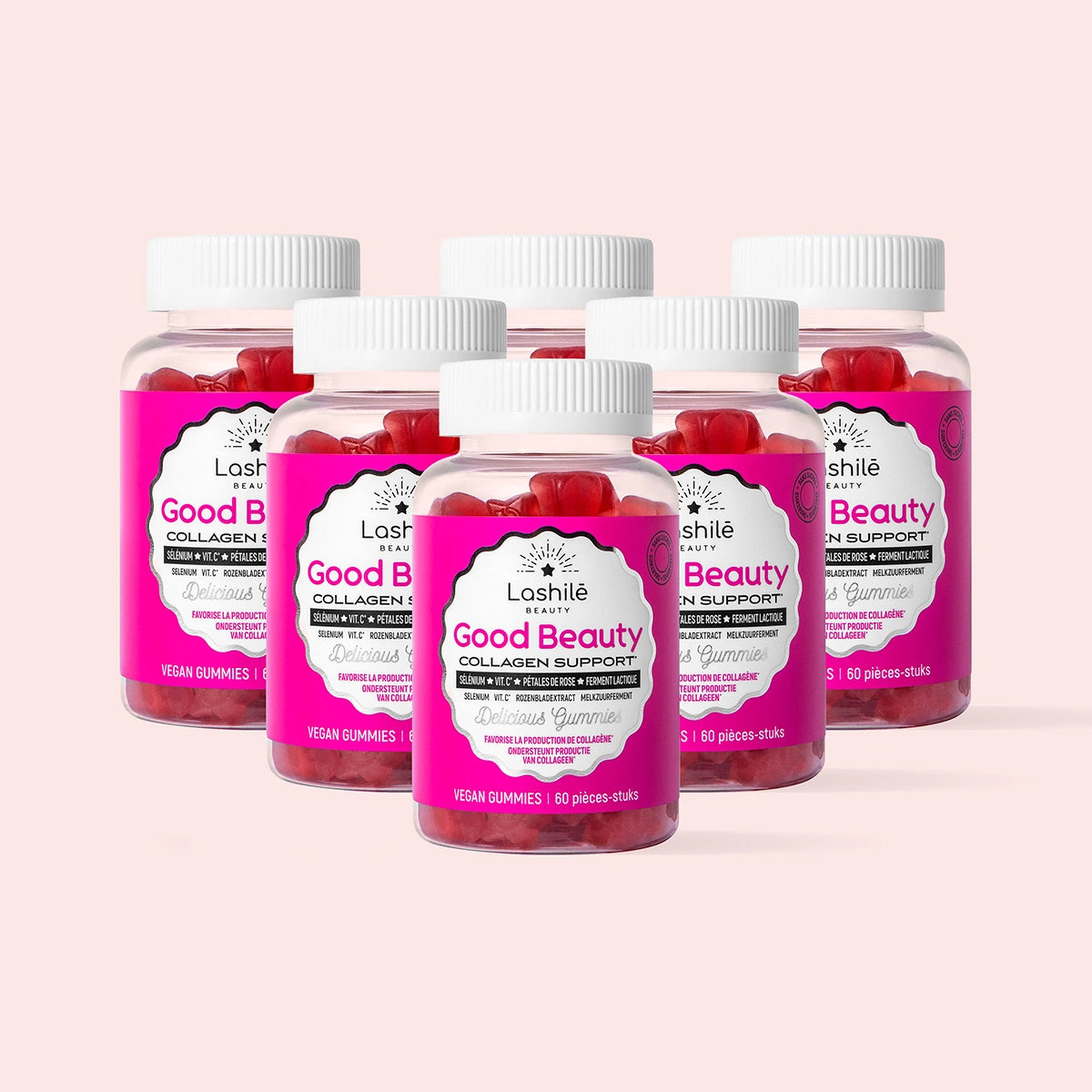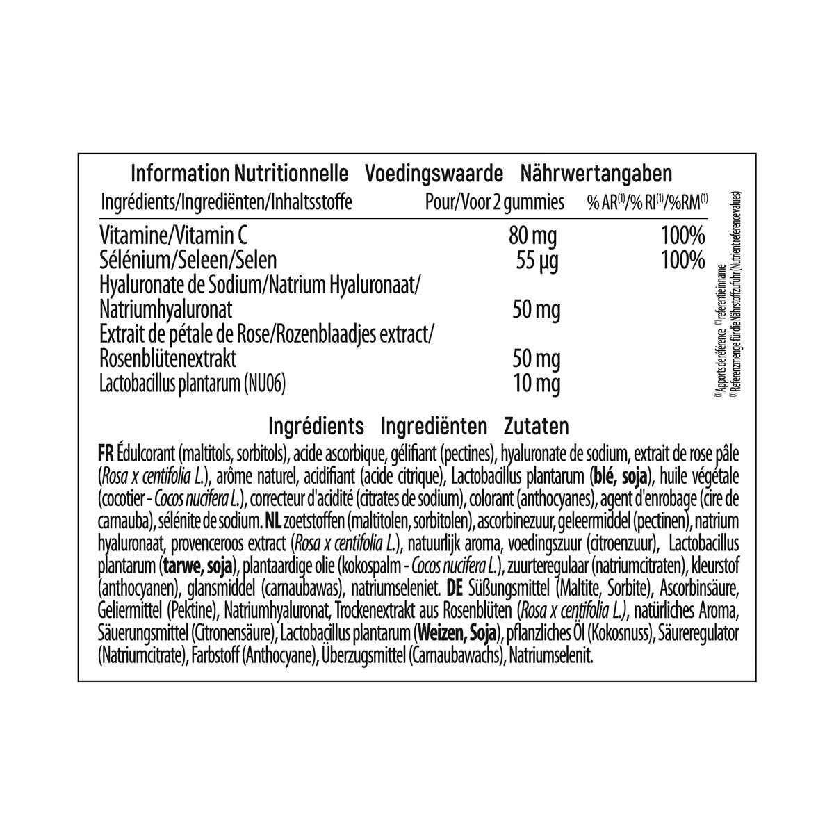 Édulcorant (maltitols, sorbitols), acide ascorbique, gélifiant (pectines), hyaluronate de sodium, extrait de rose pâle (Rosa x centifolia L.), arôme naturel, acidifiant (acide citrique), Lactobacillus plantarum (blé, soja), huile végétale (cocotier - Cocos nucifera L.), correcteur d'acidité (citrates de sodium), colorant (anthocyanes), agent d'enrobage (cire de carnauba), sélénite de sodium.